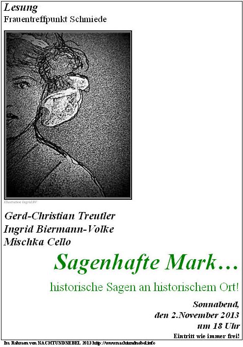 Am 2.November 2013 findet eine Lesung aus unserem Buch “Sagenhafte Mark” um 18 Uhr in der Schmiede mitten auf dem Richardplatz statt.