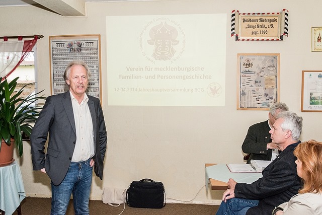 Den Anfang machte Dr. Dieter Garling vom Verein für mecklenburgische Familien- und Personengeschichte e. V., der in einem kurzweiligen Vortrag seinen Verein und dessen Tätigkeit, einschließlich der Webpräsenz und den Veröffentlichungen vorstellte.