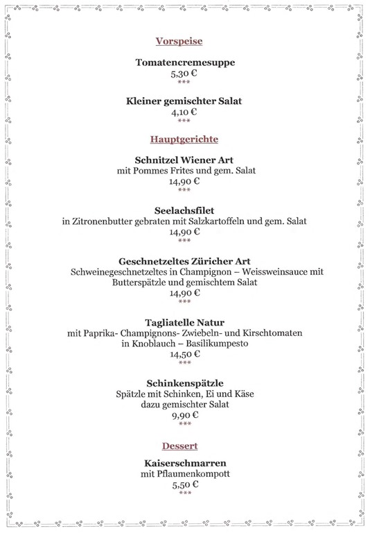 Hier ist nun die Speisekarte. Für alle, die aus verschiedensten Gründen spezielle Kost wünschen, gibt es die Möglichkeit á la Carte zu bestellen.