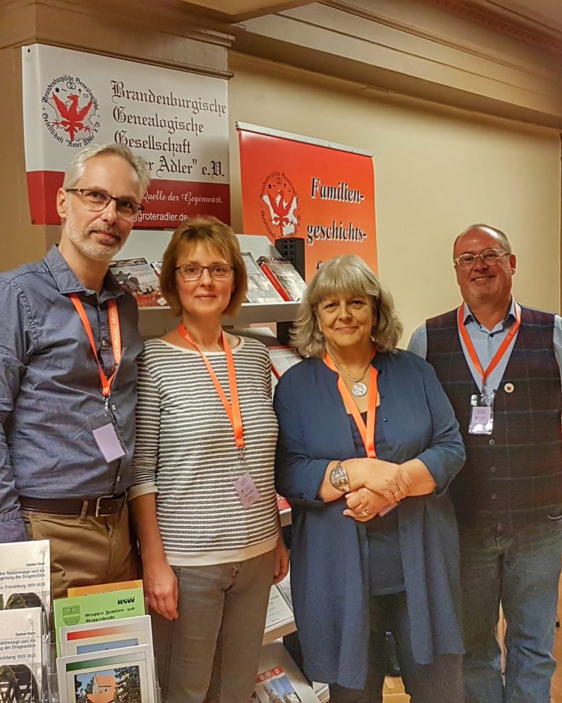Nach 2015 war Gotha auch in diesem Jahr wieder Ausrichter des Deutschen Genealogentages. Dieser fand vom 13.-15. September 2019 in der Stadthalle Gotha statt. 32 Aussteller stellten sich und ihre Waren und Dienstleistungen vor, darunter wieder viele Vereine. So war auch die BGG „Roter Adler“ wieder mit einem Stand vertreten. Angela Häring, Ingrid Volke-Biermann, Gerd-Christian Treutler und Lutz Bachmann waren als Standbetreuer angereist, um den Besuchern ihre Fragen zur Familienforschung in Brandenburg zu beantworten. Leider war der Besucherandrang in diesem Jahr nicht so groß wie in den vergangenen Jahren. Etwa 500 Teilnehmer zählte der ausrichtende Verein, die Arbeitsgemeinschaft Genealogie Thüringen e.V.