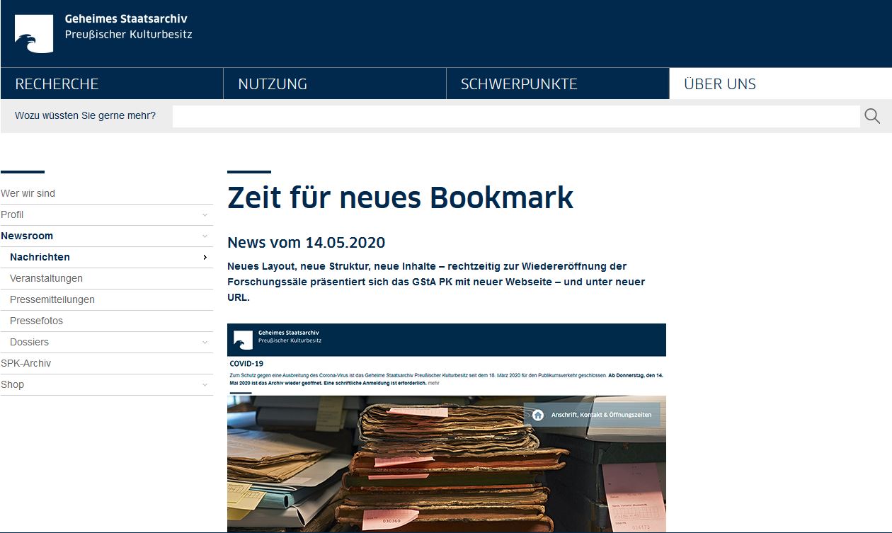 ![]() | Neues Layout, neue Struktur, neue Inhalte – rechtzeitig zur Wiedereröffnung der Forschungssäle präsentiert sich das GStA PK mit neuer Webseite – und unter neuer URL: https://gsta.preussischer-kulturbesitz.de Die komplett überarbeitete Struktur der Webseite erscheint sehr aufgeräumt und verspricht den schnelleren Einstieg zur online.Archivdatenbank, zum Bibliothekskatalog und den digitalisierten Archivalien. Ebenfalls mit einem Klick erreichbar - das online-Formular zur Archivalienbestellung. |