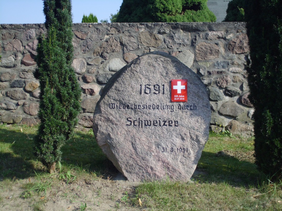 1991 fanden in mehreren Orten des Ruppiner Landes große Feierlichkeiten zum 300. Jahrestag der Schweizer Ansiedlung statt. In Schulzendorf wurde ein Gedenkstein aufgestellt (Bild 1). In Linow erinnert eine Gedenktafel am Eingang zur Kirche an die ersten Siedler (Bild 2).